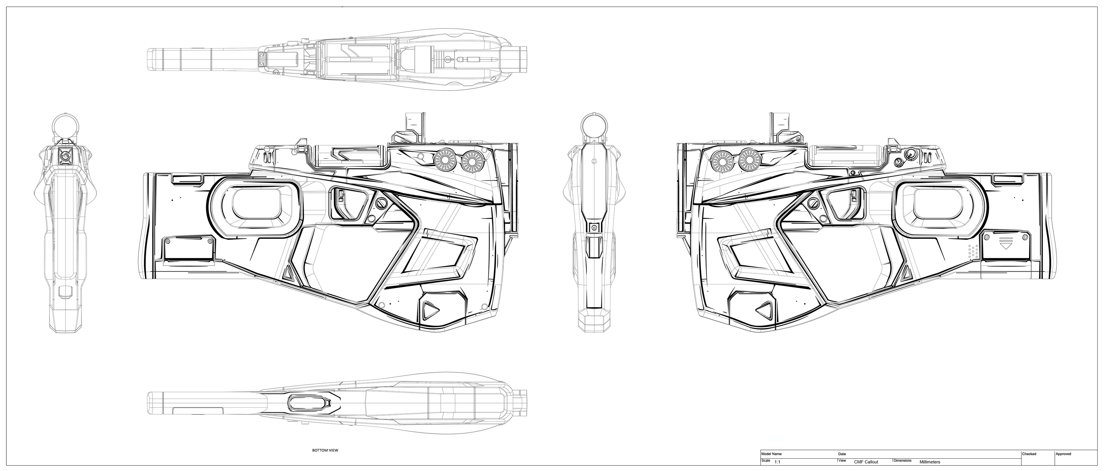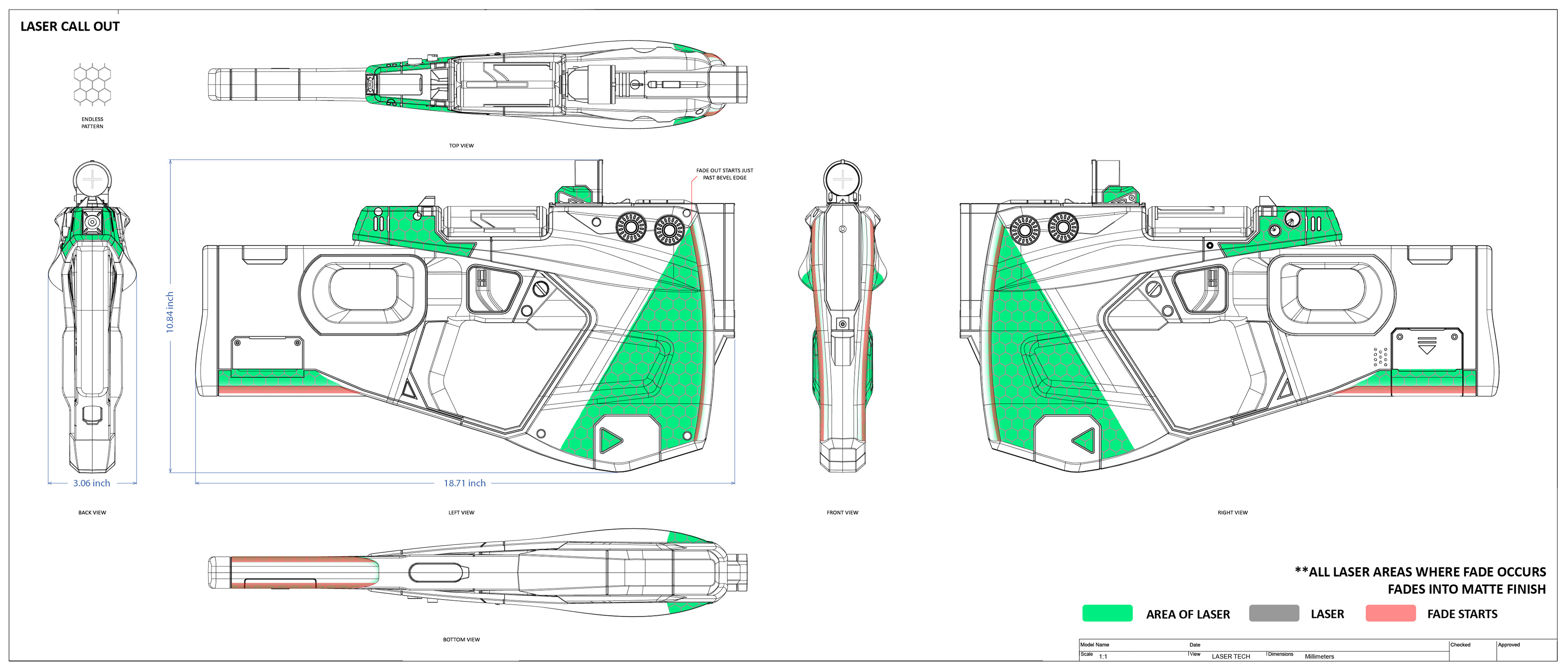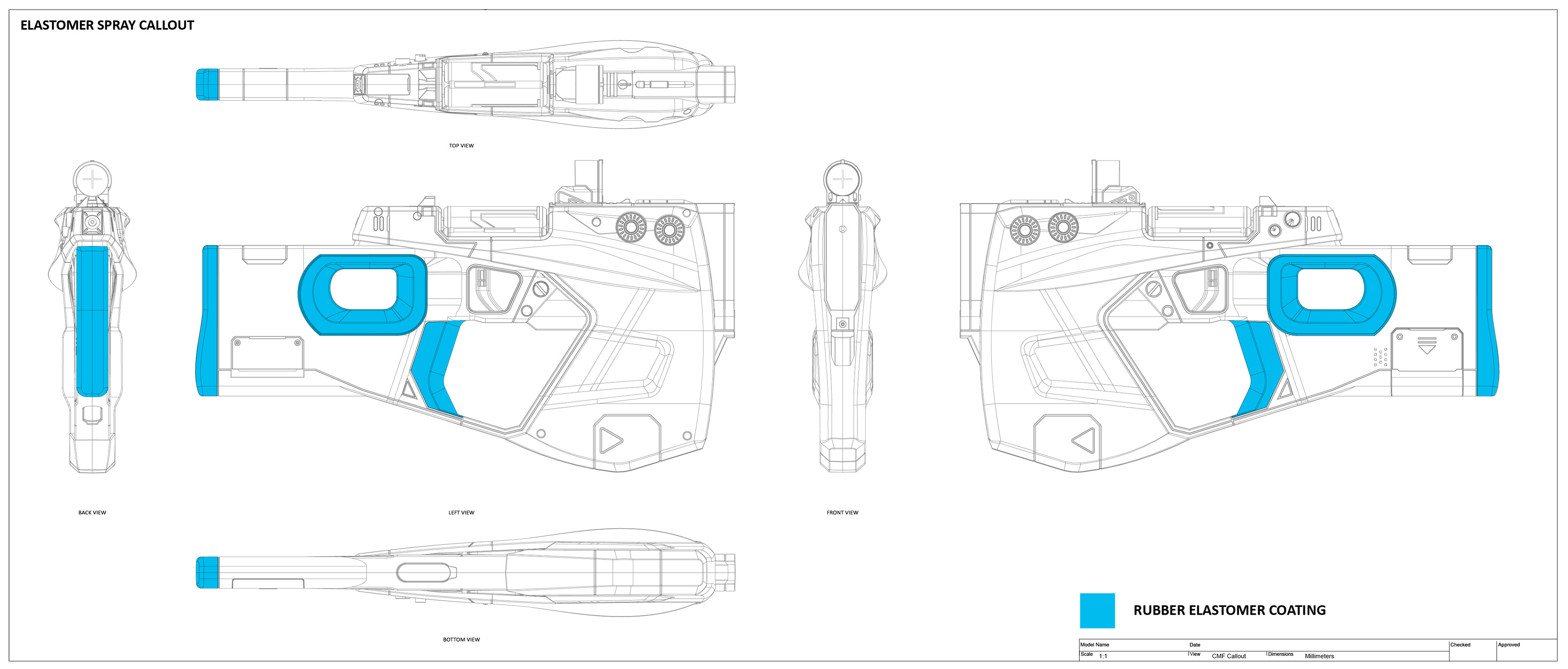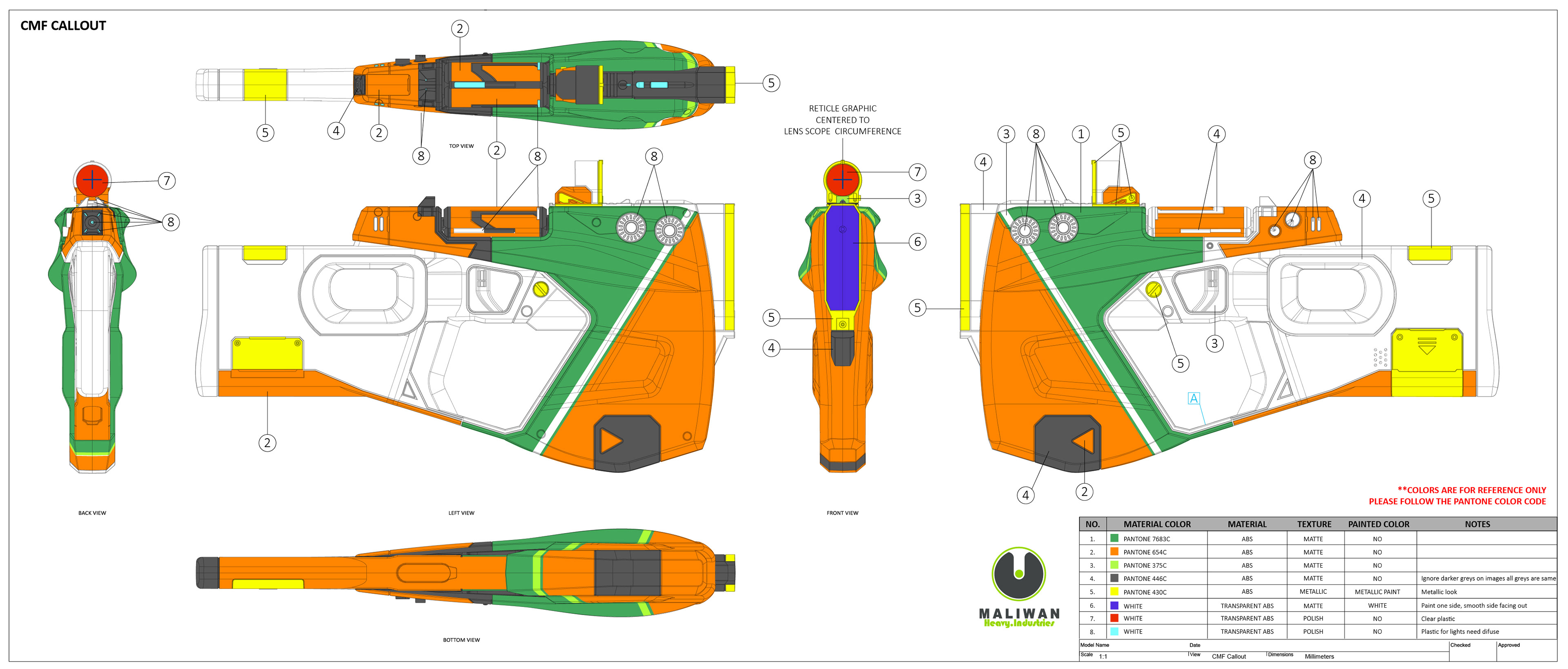 Basic call outs for color, material and finish. This also included a major decision in the project to add cell shading (like in the game) or not.